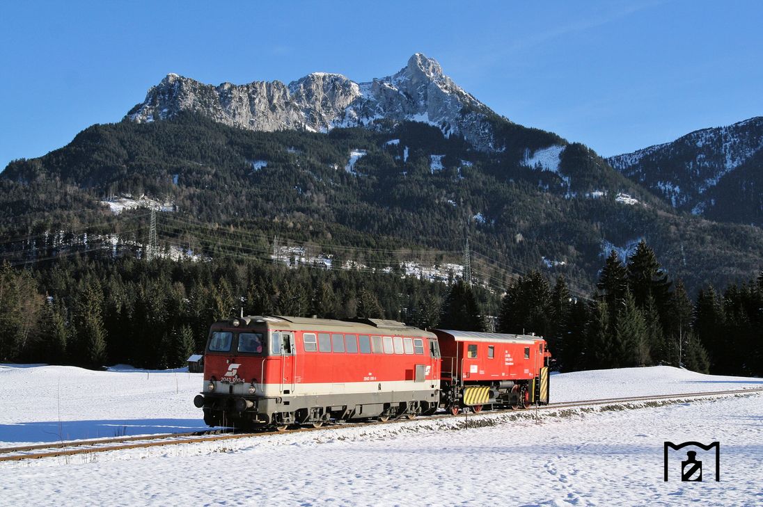 ÖBB 2043.010 mit dem ÖBB-Schneeräumer 80 81 9760 031-1 bei Pflach kurz vor Reutte in Tirol. (14.12.2006) Foto: Stefan von Lossow gefunden in der Eisenbahnstiftung.